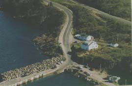 Location:East Ferry Number: Source: Dianne and Harold Theriault-Petite Passage Whale Watch and Store Notes: An ariel view of the East Ferry wharf. Top building being the Petit Passage Whale Watch, restaurant and store. The ferry named the "Joe Casey", after a local former fisherman and politician, takes carloads of people to and from Long Island on the hour.