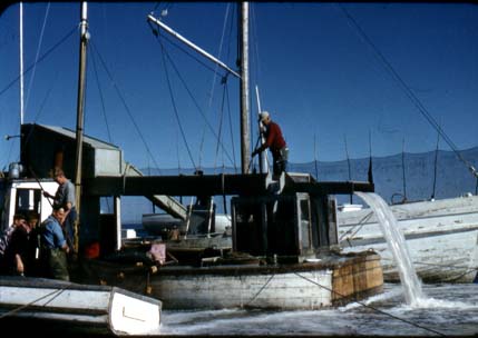 Notes: Loading herring from scaling boat in Percy's weir