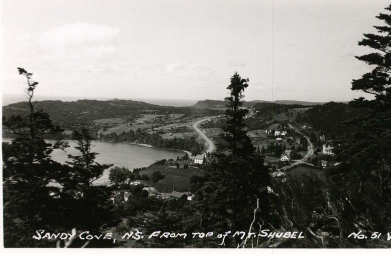 Location:Sandy Cove Number: Source: Elizabeth McCullough Notes: View of Sandy Cove from the top of Mount Shubel, #51 of collection, taken in 1940's ror 50's.