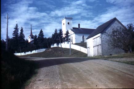 Location:Sandy Cove Number:312 Source: Eldridge Memorial Library Notes: Anglican steeple, United Church, Jeffrey's barn. Picket fences and barn are now gone.