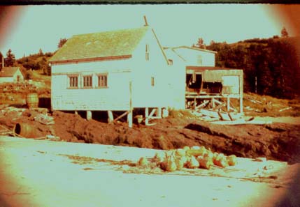 Notes: Fishing shacks, buoys on wharf, Big Cove