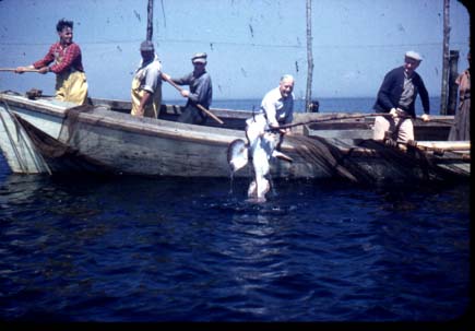 Bristol Collection - 8cc2.Image.jpg - Men in boat gaffing fish-Oscar McKay in sweater holding fish