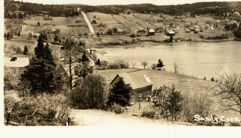 Location:Sandy Cove Number: Source: Elizabeth McCullough Notes: View overlooking sandy cove, water, trees, houses and fields. Taken sometime before 1945.