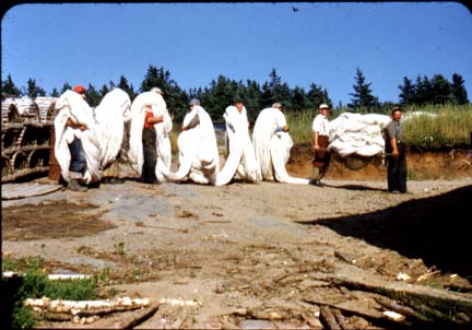 Location:Sandy Cove Number:136 Source: Eldridge Memorial Library Notes: Fishermen carrying a new fishing net, Fundy beach. Pictured is Roy Stanton, Nelson Merritt, Aubie Morehouse and Jack Morehouse.