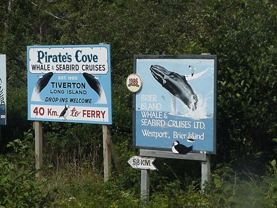 Road Signs for Whale Watches - ef5c.Image.jpg - Road sign for Pirates Cove Whale and Seabird Cruise and Brier Island Whale and Seabird cruise. Each sign has a Puffin on it.